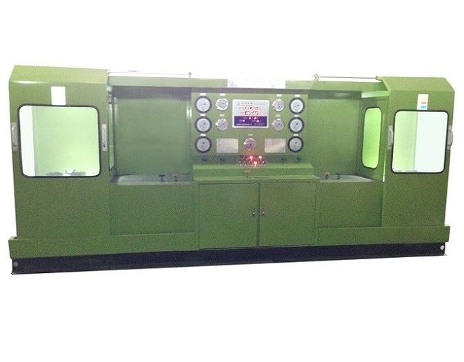 本機(jī)由液壓系統(tǒng)、機(jī)械部件,電器控制及多極氣源升壓裝置系統(tǒng)等部件組成。液壓系統(tǒng)是本試驗(yàn)臺(tái)的動(dòng)力主源。用于各類液壓缸和機(jī)械件驅(qū)動(dòng)執(zhí)行功能。試驗(yàn)面夾爪由液壓缸直接驅(qū)動(dòng)執(zhí)行,軸向夾緊壓力是按閥門試驗(yàn)壓力等級(jí)不同進(jìn)行調(diào)節(jié)增壓(最高液壓增壓壓力31 5MPa)。各夾爪受力均,夾緊可靠。徑向移動(dòng)由液壓缸傳動(dòng)執(zhí)行,各夾爪進(jìn)退同步,靈活自如,確保通徑大小不同閥門的測(cè)試。多極氣源升壓裝置是利用液氣聯(lián)動(dòng)增壓。增壓范圍0.6—32 0MPa,用于閥門介質(zhì)壓力試驗(yàn)。氣源升壓工作設(shè)有自動(dòng)和手控二種操作選擇,當(dāng)選用自動(dòng)升壓工作時(shí),工作人員可以近距離離開操縱臺(tái)觀察現(xiàn)場(chǎng)試驗(yàn)情況。